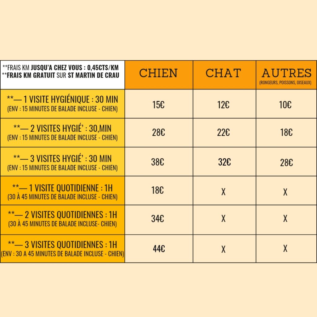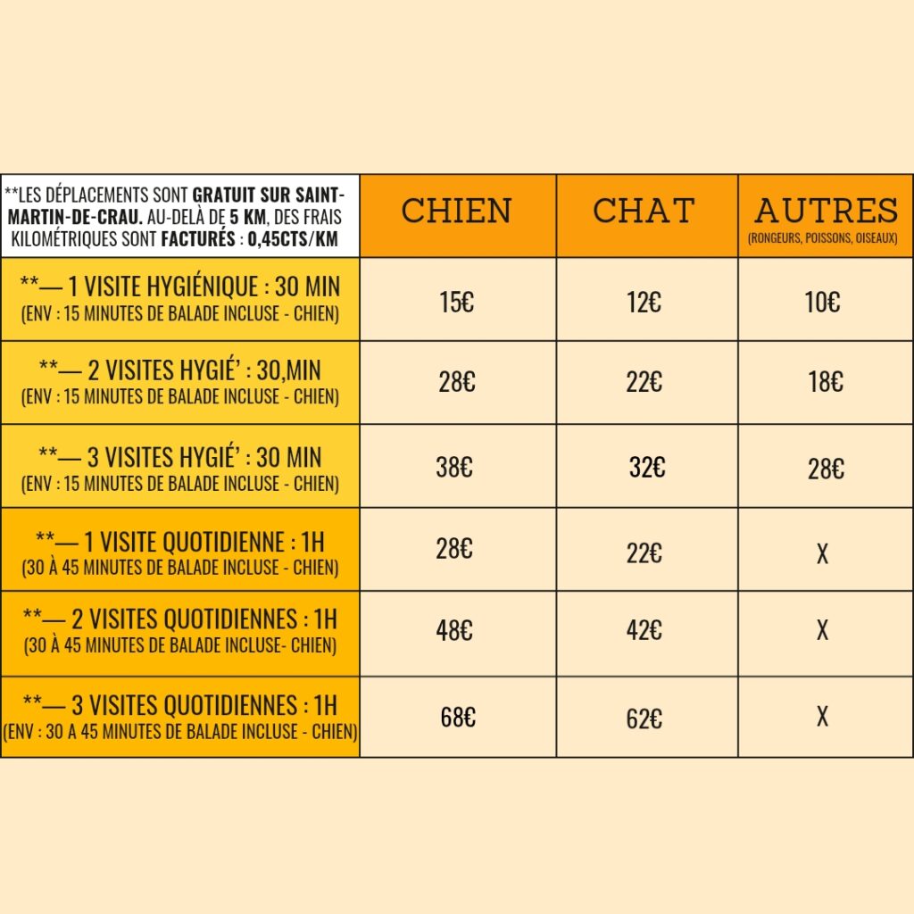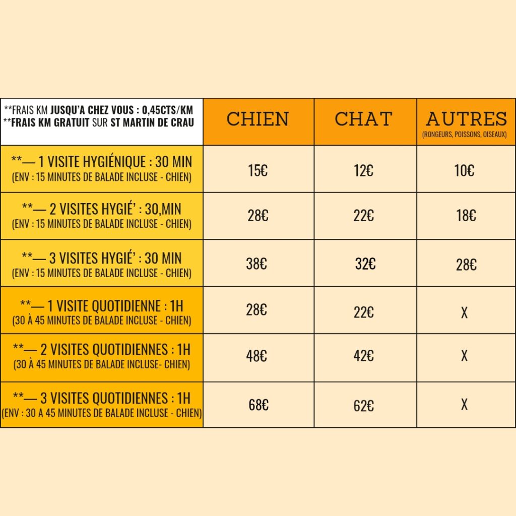 /!\ Pour une demande combinant Chien + Chat / Chat + autre / Chien + autre : le tarif appliqué sera celui de la prestation la plus élevée, auquel s’ajoutera un supplément pour chaque animal supplémentaire.